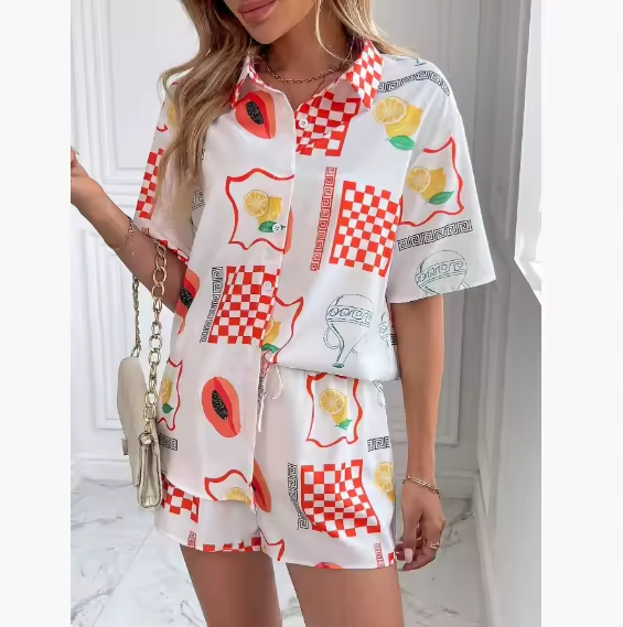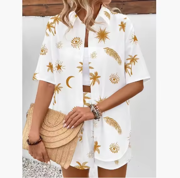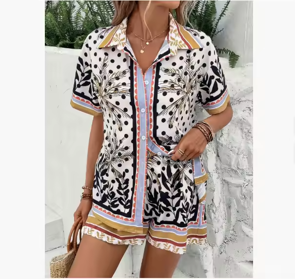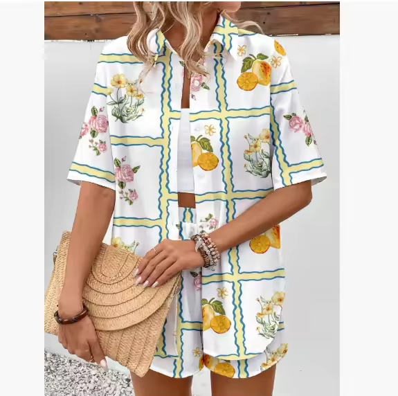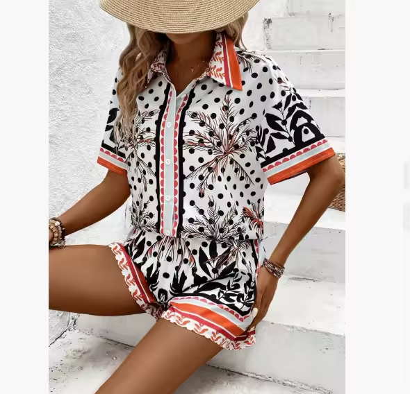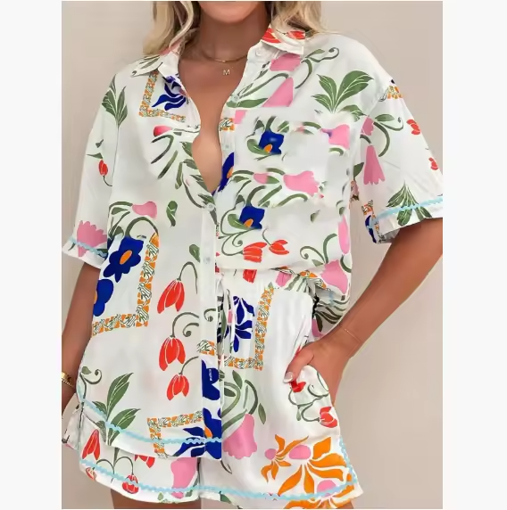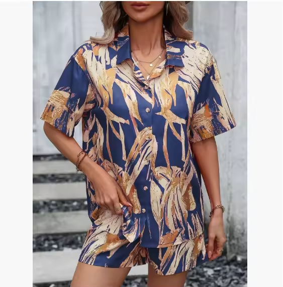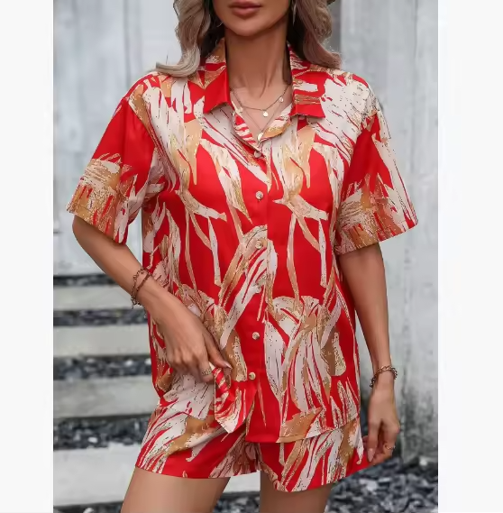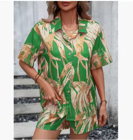 This set features a classic turn-down collar, stylish button detailing, and a relaxed fit for all-day comfort. Paired with matching loose-fit pants featuring an easy elastic waistband, this set offers the ideal balance of casual style and breezy wearability.