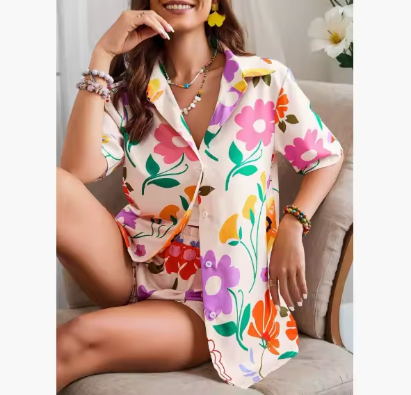 This set features a classic turn-down collar, stylish button detailing, and a relaxed fit for all-day comfort. Paired with matching loose-fit pants featuring an easy elastic waistband, this set offers the ideal balance of casual style and breezy wearability.