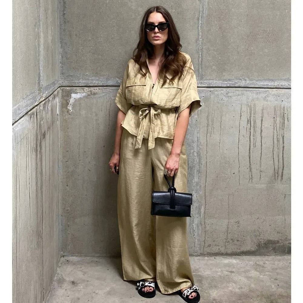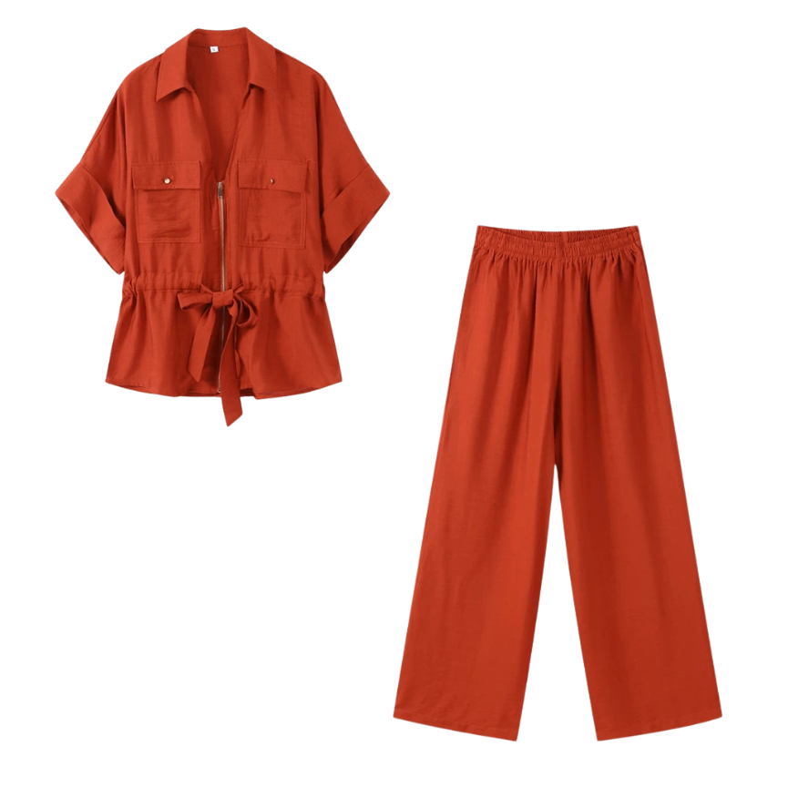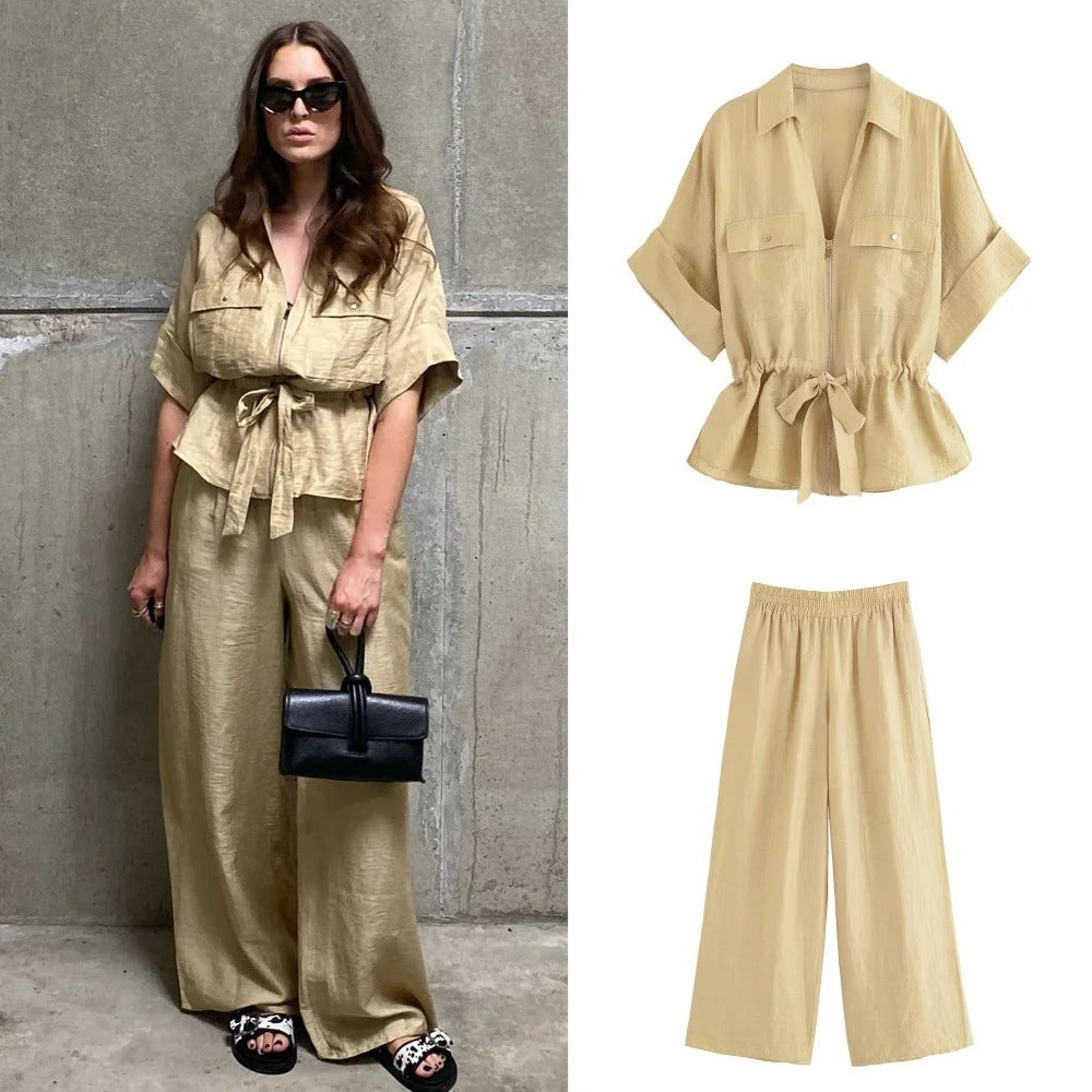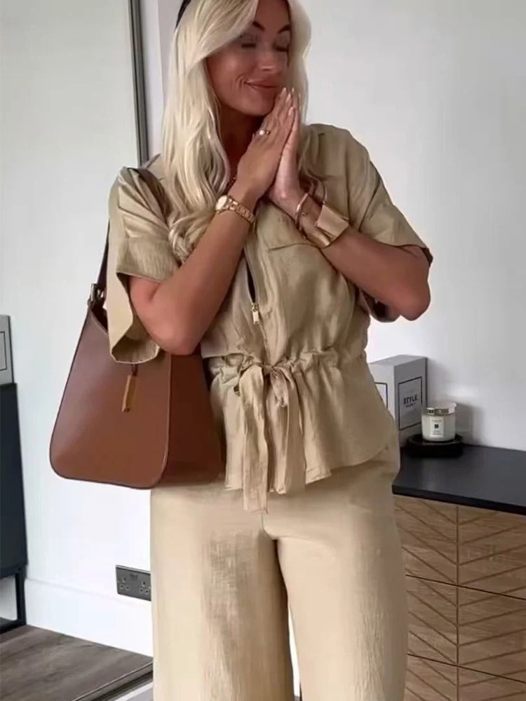 Redefine effortless fashion with the Avery™ – Stylish Outfit, a relaxed two-piece set designed for the modern woman on the go. Featuring a pleated V-neck zip-up top with lace-up detail and matching wide-leg trousers, this ensemble offers an elegant blend of comfort and contemporary style.