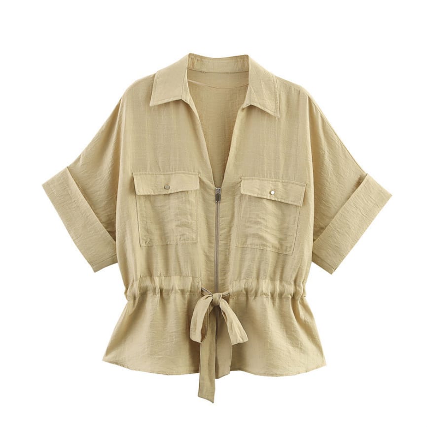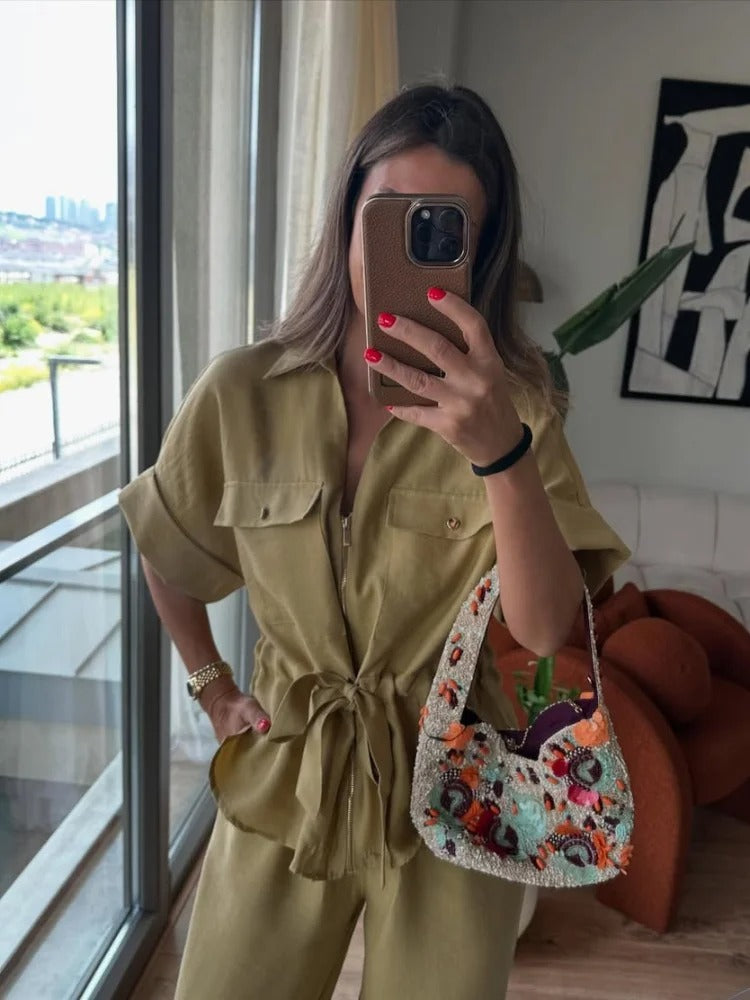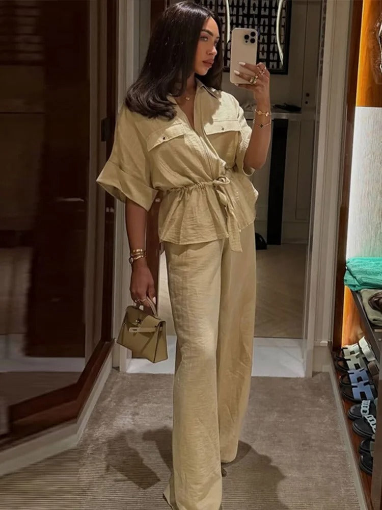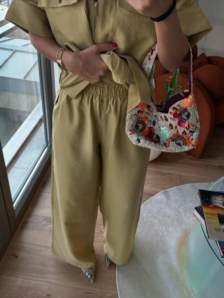 Redefine effortless fashion with the Avery™ – Stylish Outfit, a relaxed two-piece set designed for the modern woman on the go. Featuring a pleated V-neck zip-up top with lace-up detail and matching wide-leg trousers, this ensemble offers an elegant blend of comfort and contemporary style.
