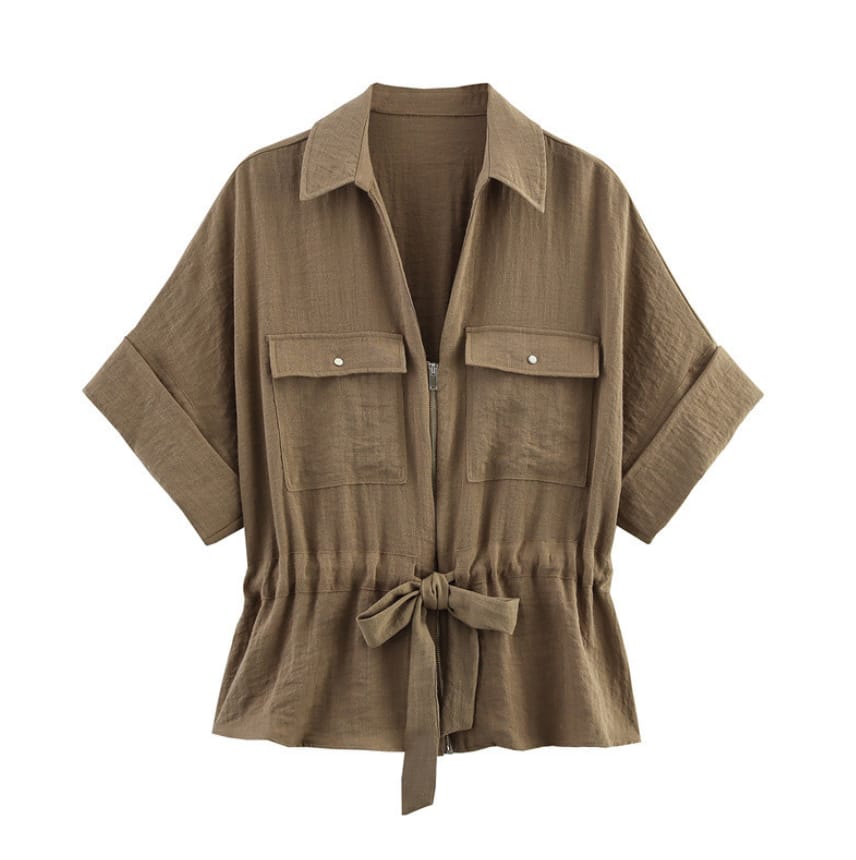 • V-neck design with lace-up detail for a feminine touch