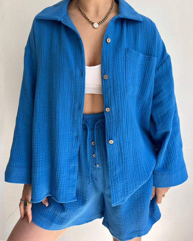 Effortless Style: Button-up top and drawstring shorts create a cohesive, chic look.